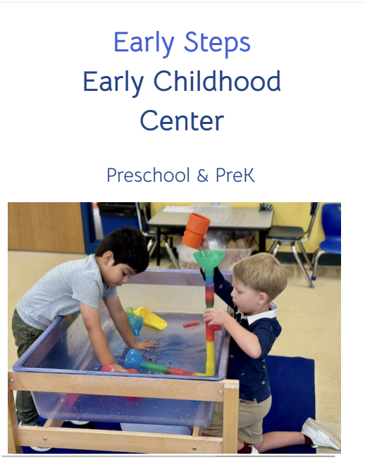 We are very excited to welcome students, parents/families to the Early Steps Early Childhood Center. While our Preschool and PreKindergarten (PreK) share the goal of preparing 3-5 year olds for kindergarten, more importantly, the experience helps shape students’ view of themselves as successful learners and playful partners, and to realize their individual value within our school community. The fine staff at Early Steps have created a thoughtful, student-centered environment. A few documents to help you learn about Early Steps and upcoming important dates include: